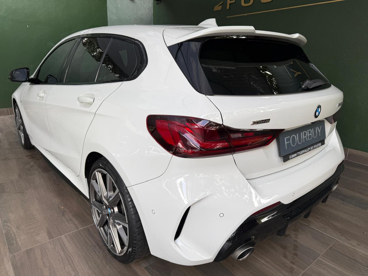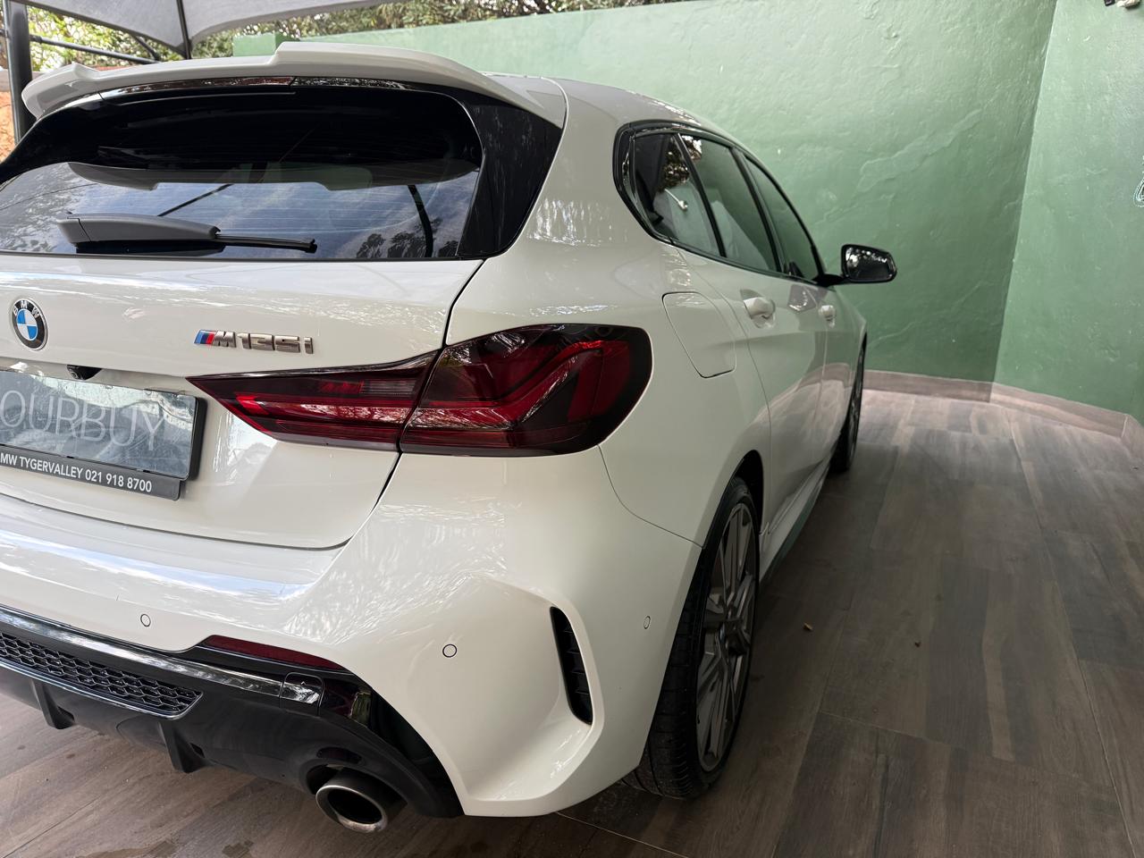 2019 BMW M135i xDrive in white with full service history, combining hot-hatch performance with everyday usability. The 2.0l turbo i4 petrol engine delivers 225 kW and 450 Nm through BMW's xDrive all-wheel drive, giving confident traction and a rapid 0 to 100 km/h in 4.8 s, while averaging a claimed 7.5 l/100 km from a 50 l tank. Top speed is electronically limited to 250 km/h and CO2 emissions are rated at 170 g/km, making this a strong performer with sensible running figures for its class.